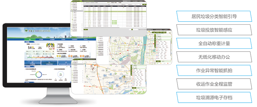 通过实时的数据交换,实现垃圾分类、收集运输、处理,人机交互界面实现用户和系统的互动。